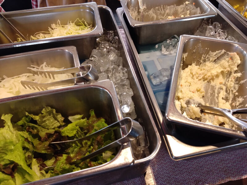サラダバーはレタス、きゃべつ、オニオン、コーン、マカロニサラダ、ポテトサラダ