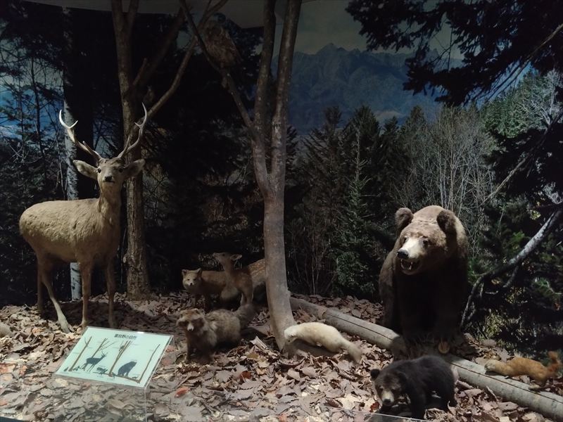1階は動物はく製、昆虫標本、地質、岩石などの